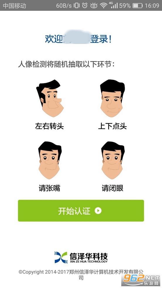 3、登录成功后,进入示例界面,在随后认证的过程中按示例和语音提示进行操作,然后点击,开始认证;请确保前置摄像头或后置摄像头可以正常使用;