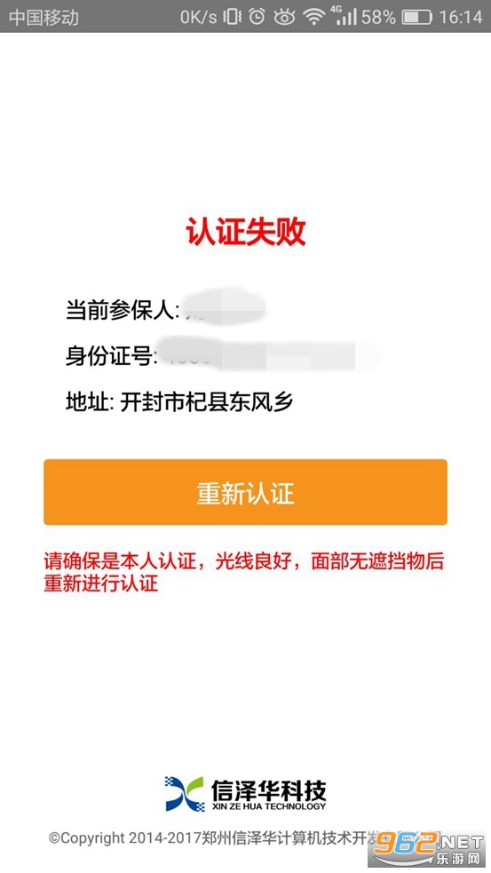 5、认证完成后,自动进入查看结果页,如果是本人参保,则会提示认证成功,显示出参保人的信息。若认证失败,点击,重新认证即可。