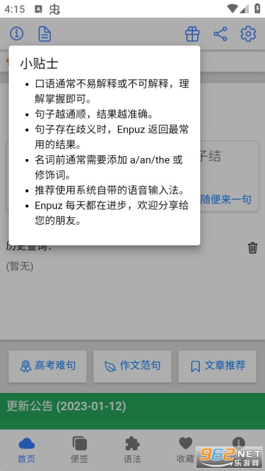 Enpuz是一款非常好用的英语学习工具,不仅可以查询单词意思、翻译语句,还能学习各种语法和好久,操作起来非常的简单,而且每一次的分析注解都非常的详细,可以帮助学生们充分的了解并领悟。还有很多的好句推荐,你可以充分的运用到英语作文中,这绝对是一项加分项!