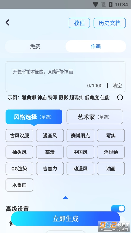 《Ai画图app》是一款为朋友们打造的AI生成艺术图片的软件,朋友们可以使用Ai画图app来制作各种各样的精美图片,可以选择古风、漫画、抽象、赛博朋克等各种不同的风格,也可以选择自己喜欢的艺术家,写上一段文字,点击立即生成来生成对应图片。