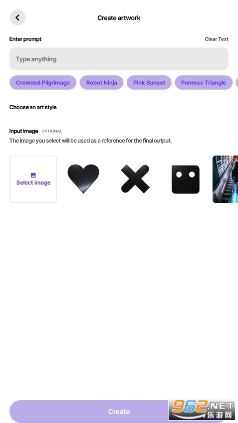 输入您想创建的任何内容! ——“外星空间站”、“城市日落”、“彩虹森林”或任何你能想象到的东西,都只是数十亿幅潜在画作中的一小部分。让你的创造力接管!