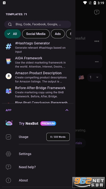 NexBot是忙碌的内容创作者和企业家的完美人工智能文案助手。使用 NexBot,您可以快速为电子邮件、广告、网站、列表、博客等创建高质量、引人入胜的内容。只需选择一个模板,填写表格,NexBot就会生成输出列表供您选择。您还可以通过添加自己的关键字和短语来自定义内容。NexBot 可以轻松创建独特、写得好的内容,这将帮助您扩大在线影响力。