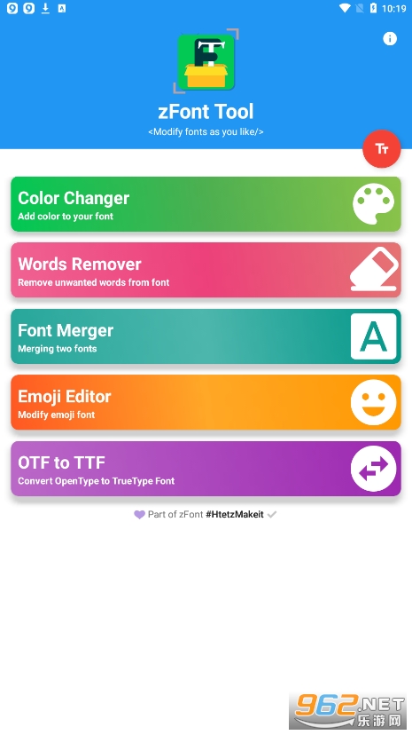 《zFont tool app》是一款非常好用的字体美化工具,里面拥有各种各样的素材,海量的色彩让大家免费使用,在这里你可以自由更改手机字体,颜色等等,还可以免费使用里面的emoji,图片和表情,让你的手机内容更丰富,有兴趣就来下载吧!