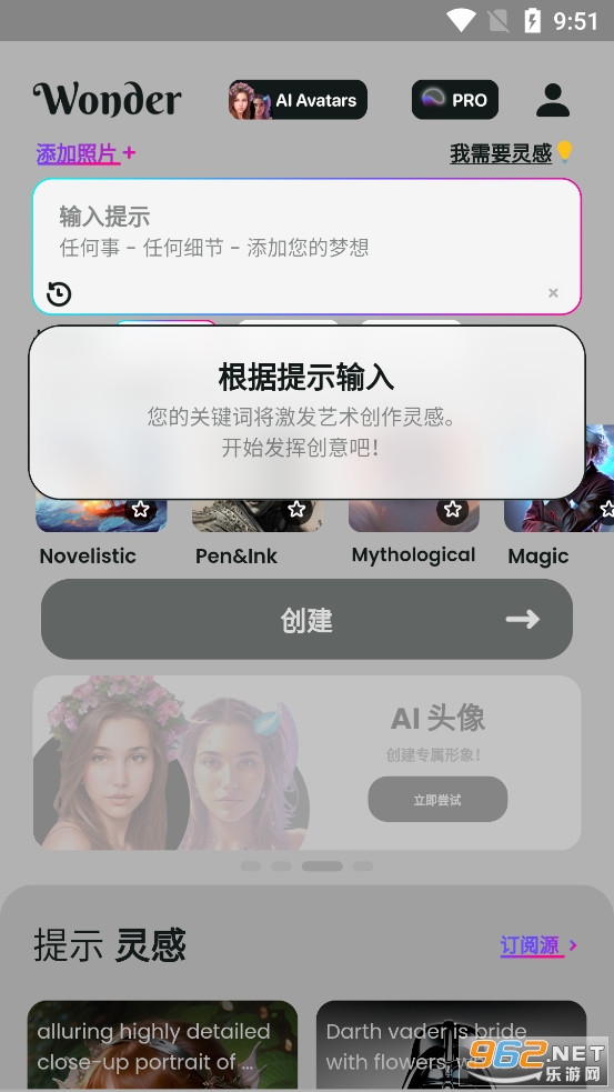 《Wonder软件》是一款为朋友们打造的人工智能艺术生成器软件,朋友们可以在软件中输入一定的关键字,然后选择想要生成的风格即可智能生成对应的图片,比如可以输入海边、长发美女、微风、夕阳等等,点击创建观看广告后即可生成成功。