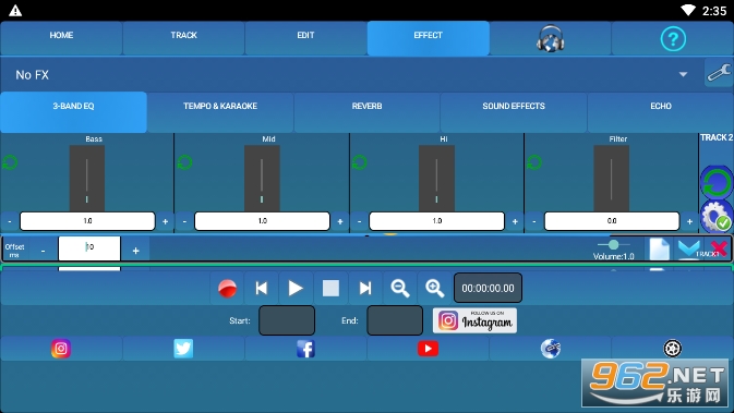 音频效果包括均衡器(低音、中音、高音)、滤波器、节奏、音高转换、卡拉OK、混响、混响室大小、混响阻尼、翻边、门、嗖嗖声和回声效果。可以使用控制面板调整每个效果的值。你可以调整音乐的音高和节奏。您可以保存和加载自定义FX预设,例如:低音、大厅混响、音乐厅混响、预定义的音高预设。