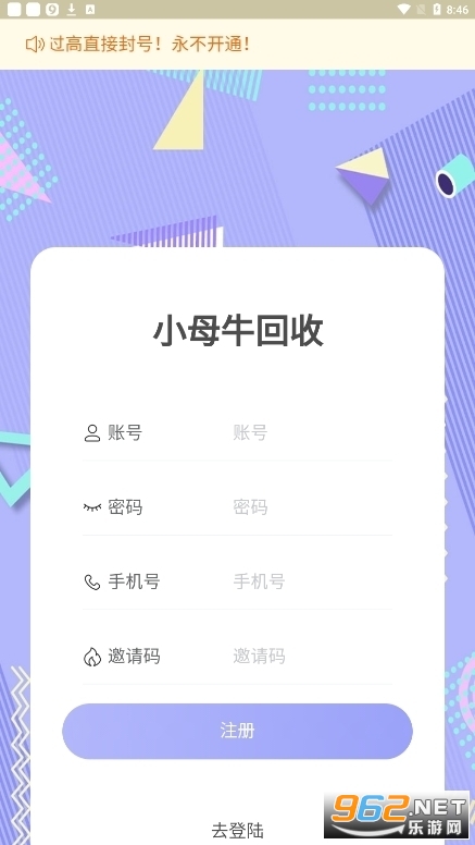 3、输入您刚刚获取的邀请码,即可登录小母牛回收,开始使用小母牛回收App