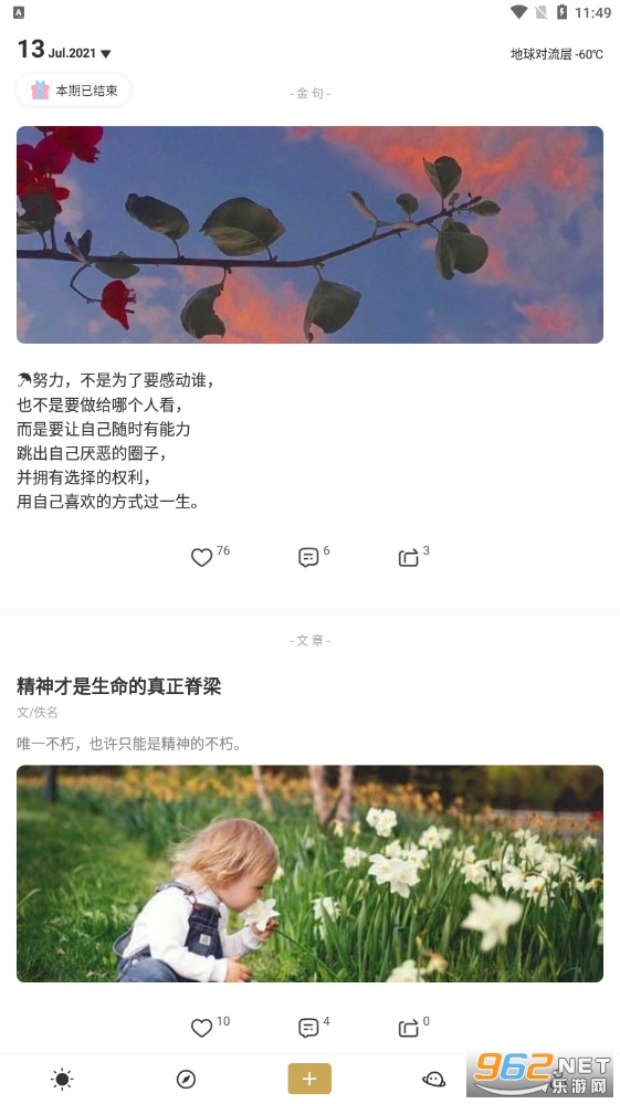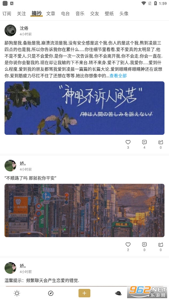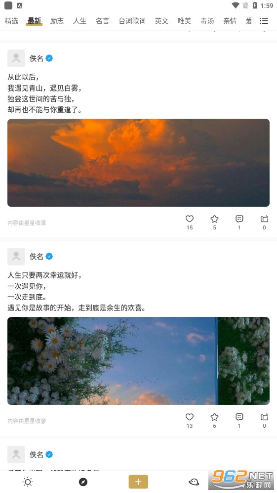 一款非常有趣的语录分享软件,在这里有着优秀的语言和句子,你将在这里查看各种各样的语录,充满了文艺的气息,还能够帮助你分享各种话题和文案,同时整体也非常有设计感,推荐给有需要的用户。