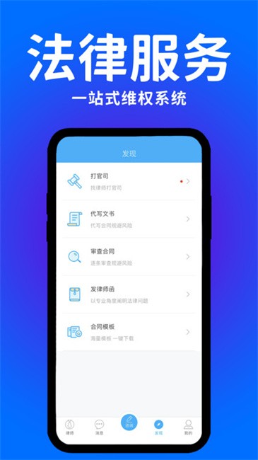 3、发现板块提供了多项专业法律服务,包括诉讼案件代理法律文书代写合同内容审查律师函发送及合同模板下载。