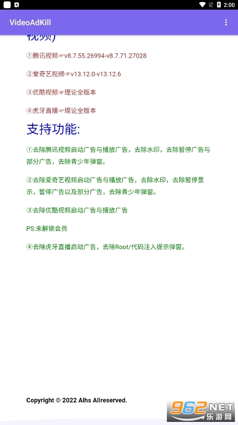VideoAdKill最新2026版——它体积小,安全无毒。它相当于一个手机插件,可以在没有root权限的情况下直接使用。下载相应版本的视频应用程序可以删除启动广告和播放广告,这非常实用。