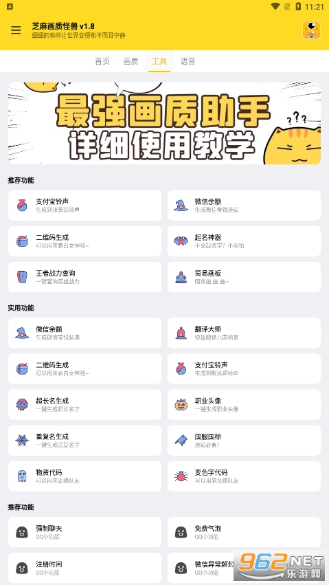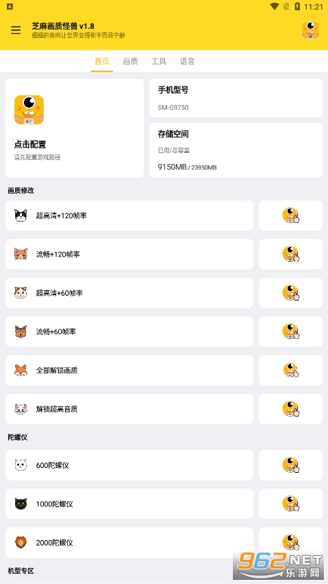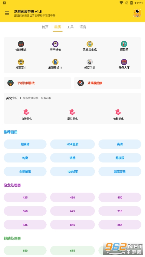超级好用的一款画质修改工具,除了能够修改画质之外,还有陀螺仪,处理器选择,以及语音包和一些其他的玩机实用功能可以让大家体验,非常方便!