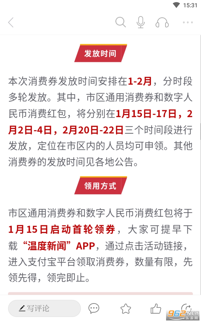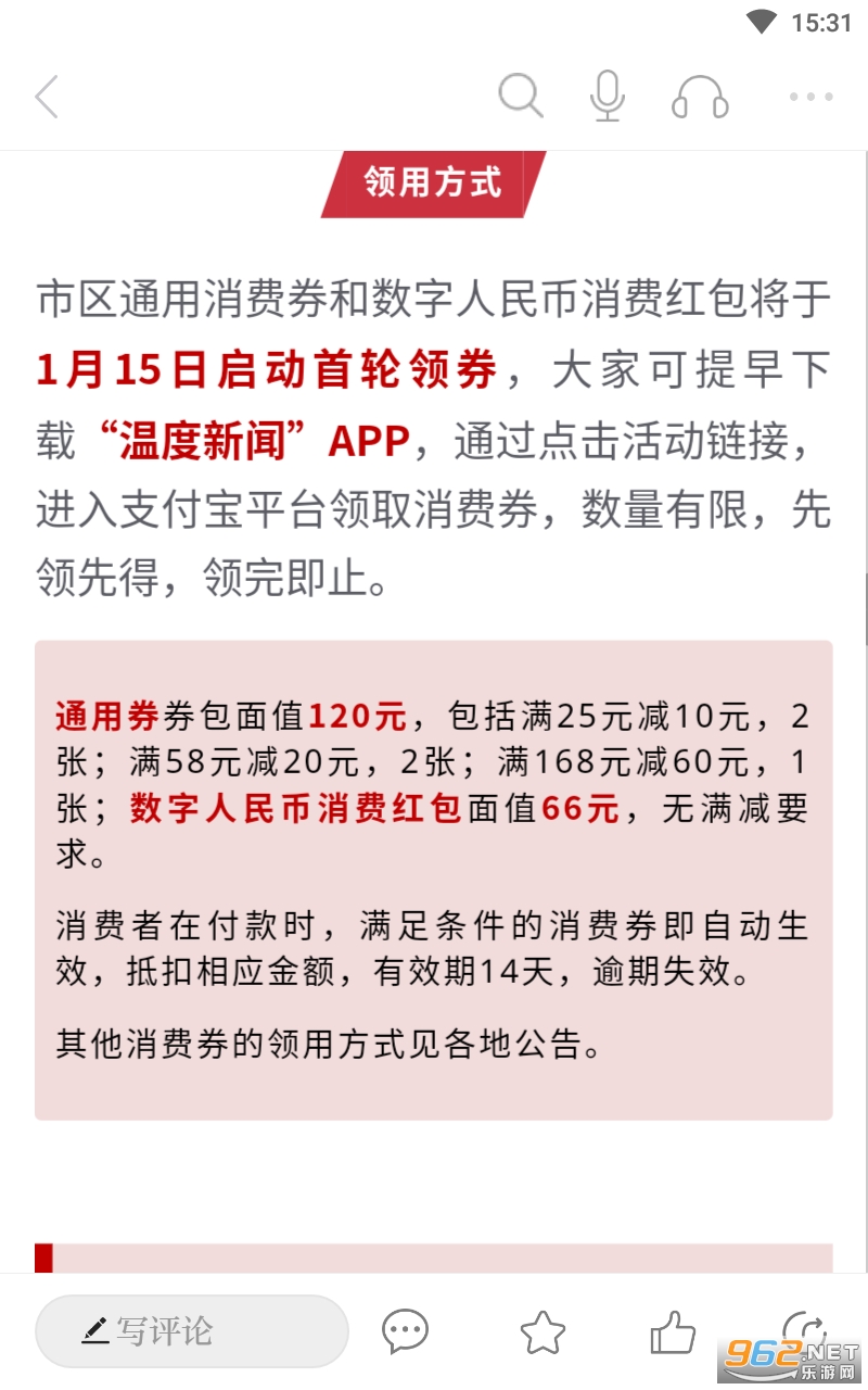 市区通用消费券和数字人民币消费红包将于1月15日启动首轮领券,大家可提早下载“温度新闻”APP,通过点击活动链接,进入支付宝平台领取消费券,数量有限,先领先得,领完即止。