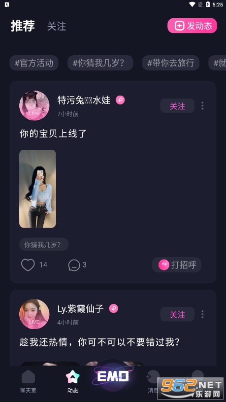 3、动态分享,直接分享你的动态,动态记录你的生活,传递正能量,不用担心奇怪的眼睛。