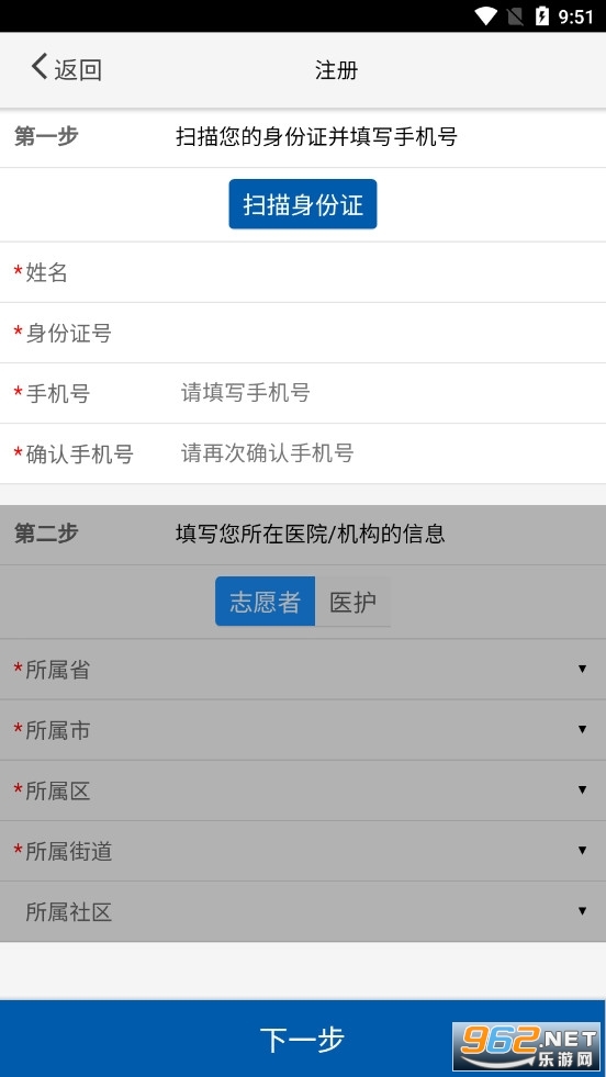 4、然后输入你所在省,市,区等详细信息,点下一步就可以注册成功能了。