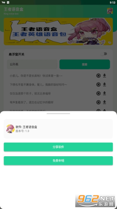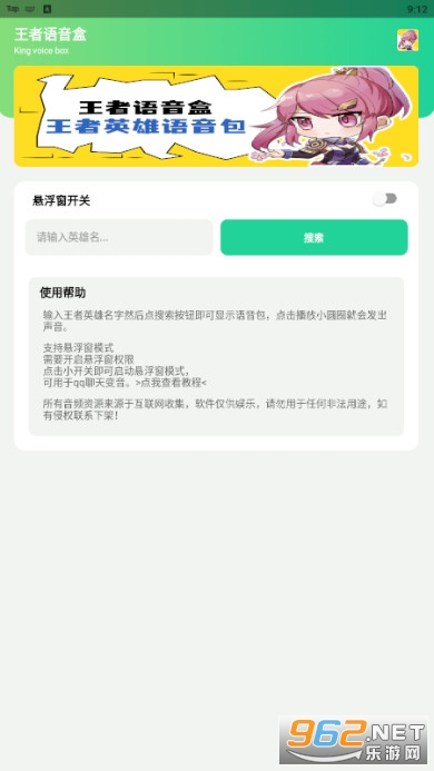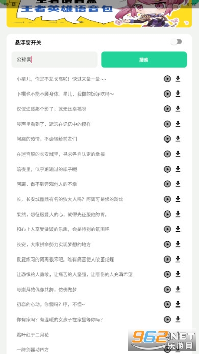 一款有趣的王者荣耀语音盒子软件,在这里你可以输入英雄名来获取ta的语音,还可以快速进行下载,免费提供各种语音,软件的操作简单,让你能够扮演各种英雄,推荐给有需要的用户。