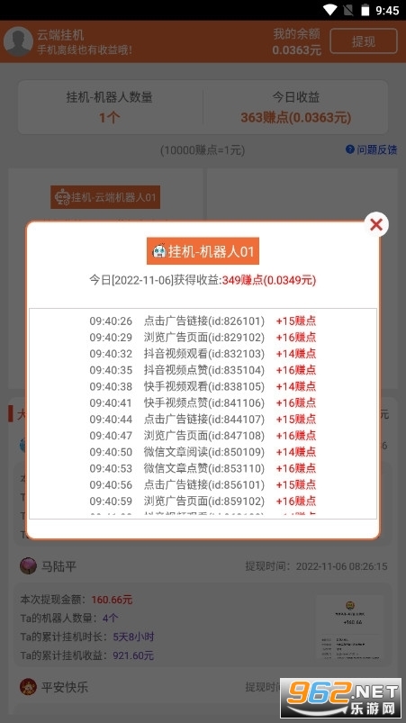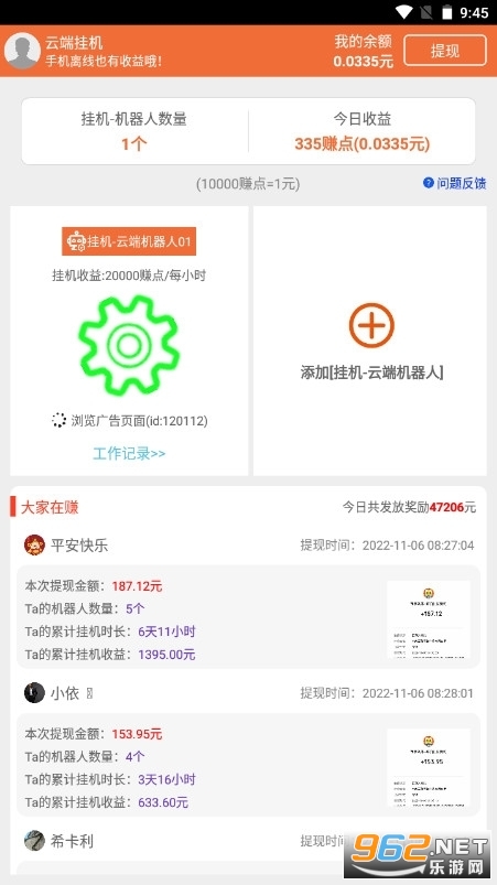 云端挂机机器人赚钱这个应用程序提供了一个非常全面的挂机内容。用户可以合理利用机器人为自己赚钱,从而获得更丰厚的收入。总的来说还是很不错的。随时可以赚钱提现。只要用户操作合理,不违法,就不会有被屏蔽的风险。软件主要是离线模式,提供丰富的挂机任务赚钱,系统会很智能的根据用户需求推荐合适的。感兴趣的小伙伴们快来下载试试吧!