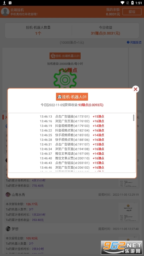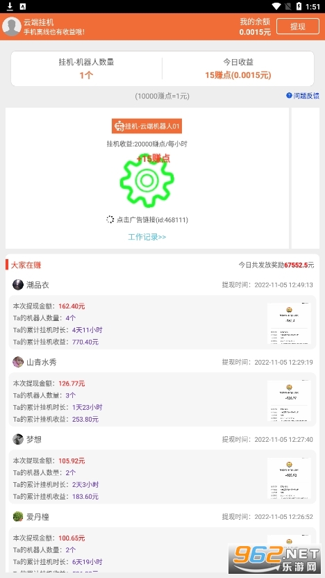 《云端挂机软件》是一款非常好用的挂机就能赚钱类的网赚软件,发布了丰富的任务,直接接单完成任务就能够赚钱,邀请好友就能够增加挂机机器人,获取更高的收益。有需求的话就快来下载吧!