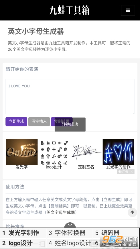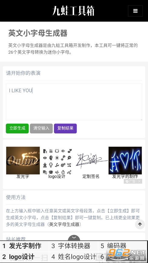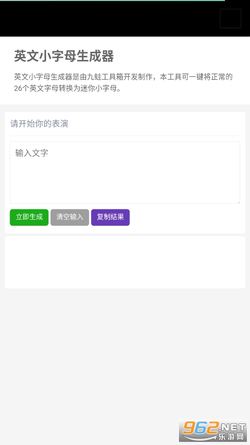 英文小字母生成器是由九蛙工具箱开发制作,本工具可一键将正常的26个英文字母转换为迷你小字母。