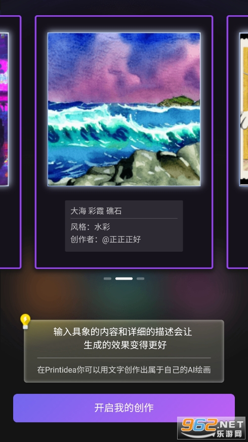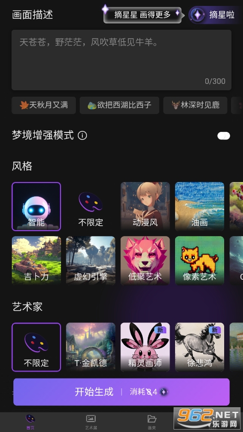 超级好用的ai绘画生成器,里面拥有非常多的模板,各种绘画风格,可以让大家自由选择,操作简单,输入一句话就可以生成相关的画作,十分方便!
