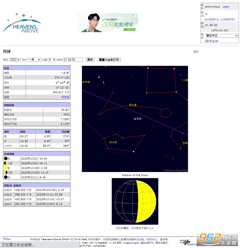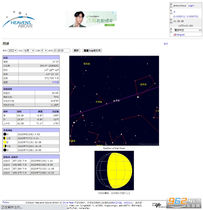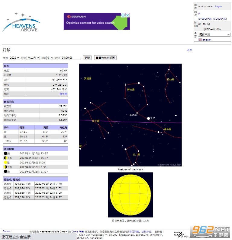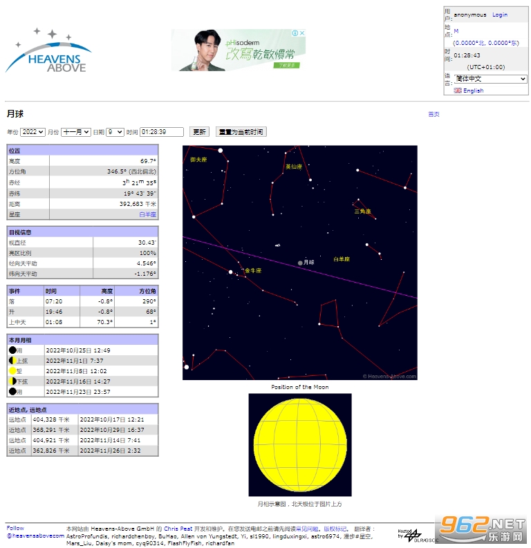 更多详细信息,例如月地间距离,月球的年龄还有当前的海拔。可以查看任意日期上的信息。