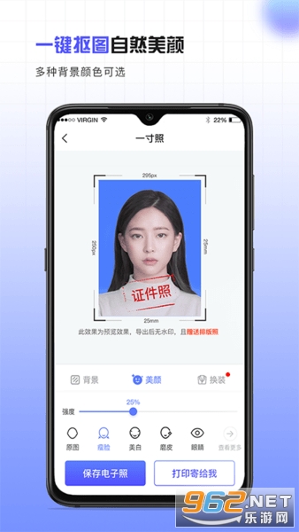 使用了目前业内领先的AI图像识别算法,可以一键自动裁切头像适应照片,自动校正,边界模糊修复,光线自平衡,适应冷暖环境色等。轻松拍摄自然美颜的专业合规证件照!
