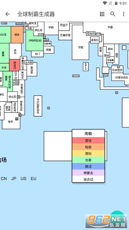 《全球制霸生成器》全球部分国家地区制霸标记生成工具中国,有着多个标记记录方式可以自由的选择,包含了居住、短居、游玩、出差、路过、没去过六个自由的选项,根据自己所到的地方选择,如果还没有来得及去或是去过以后回来的,也可以算作其中。