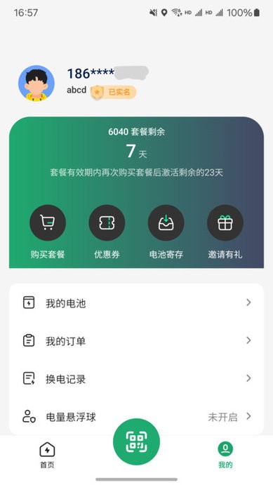 4、扫描换电柜二维码快速更换电池,实时显示电量与计费明细。
