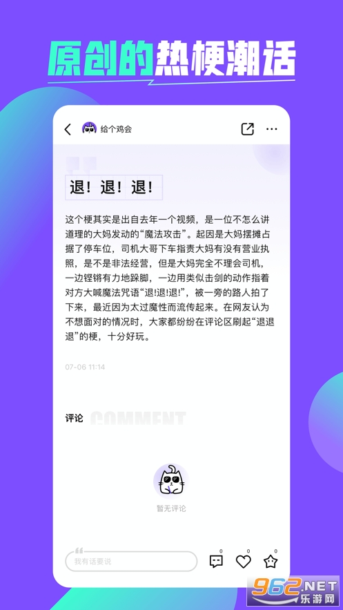 1.“喵更”是年轻化潮流表达社区,用户可围绕词-热梗百科、句-语录创作、图-表情Meme图等,创造、分享原创作品。