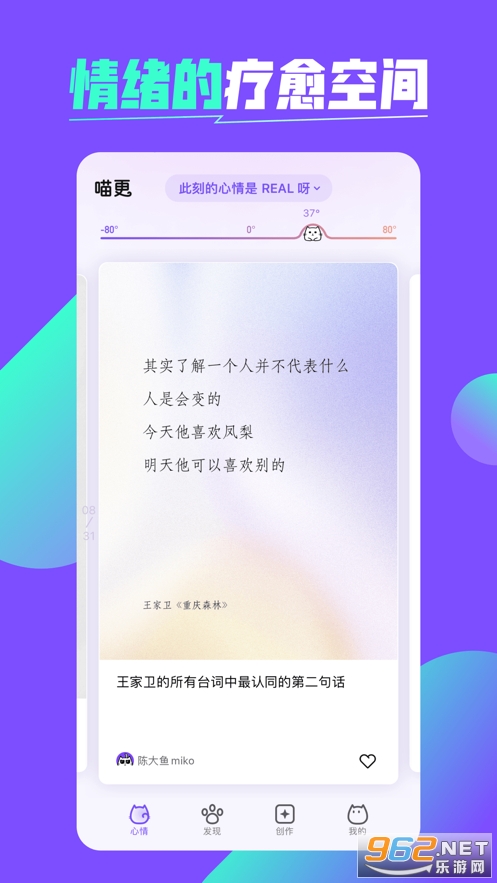 2.据悉,“喵更”的界面主要分为“心情”、“发现”、“创作”和“我的”四个板块。