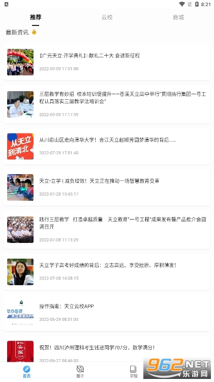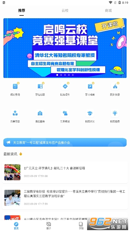 天立云校app是一款智慧教育平台,平台拥有成绩查询,学倩追踪,精准提升,云校资源,圈子等等功能服务,可以更好的家校共育,帮助孩子更好的学习成长。