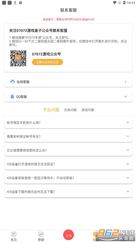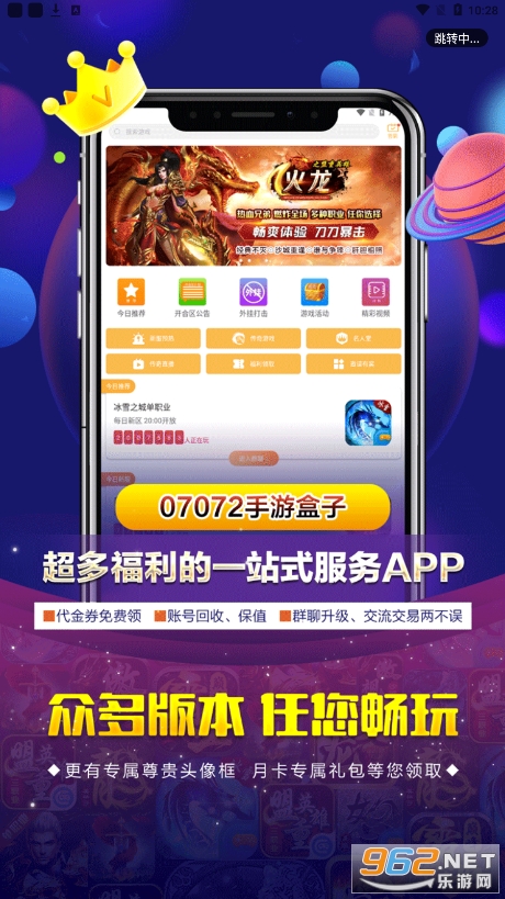 《07072手游盒子》又叫《07072游戏盒》、《07072交易平台》、《07072手游平台》,是一款功能丰富的游戏盒子,这里拥有非常多的无限元宝公益服手游,各种好玩的传奇游戏,变态游戏,让大家可以随时随地下载,超多的福利,上线就送vip,领海量钻石,获得稀有礼包,还可以和其他的玩家在线交流,在线交易,功能强大!