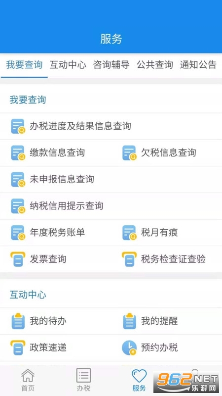 三、我要查询:办税指南助您了解办税流程和所需资料等;大厅实况让您实景查看各办税厅排队情况,避开拥堵高峰;进度结果让您快速查看税费事项办理进度,也可扫描查看电子缴款凭证信息;征期日历提供每月征期查询;帮您算税为您计算有关税费缴纳信息;纳税信息方便您随时查看税费缴纳情况;发票真伪提供发票代码(号码)、查询码、二维码查询服务,可查出发票的详细信息,维护消费者权益;我的下载:常用涉税费文书和操作指南文档查阅等。