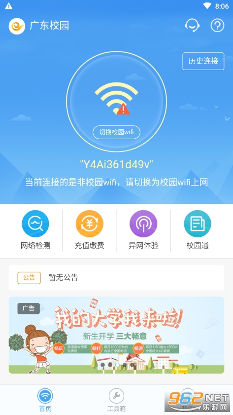 广东校园宽带:为学生打造的校园宽带连接工具,以宽带拨号为中心,功能简洁,账号密码轻松拨号,网络安全有保障,随时为您提供快速、稳定的上网环境。为在校生提供校园相关热点资讯、在线学习、就业信息、娱乐社区等资讯。