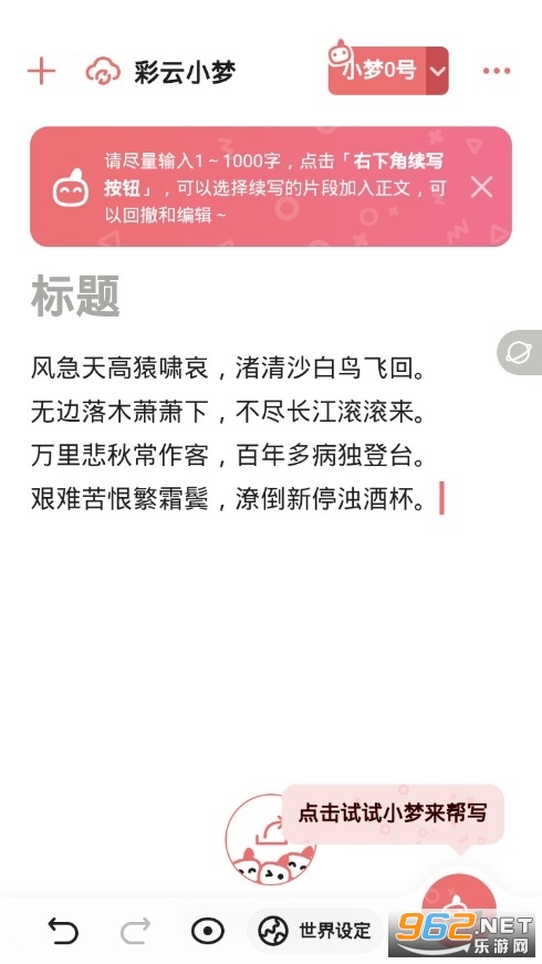 彩云小梦一款超棒的写作类软件,强大工具,专业的进行写作,完美强大的进行分析创作,大量的格式轻松导出,专业好用,自由分析给力,帮助你轻松排版布局,开启小梦续写,点击设置可对续写长度自定义字数,由您决定续写内容末尾是否为完整短句,轻松创作,随心所欲。