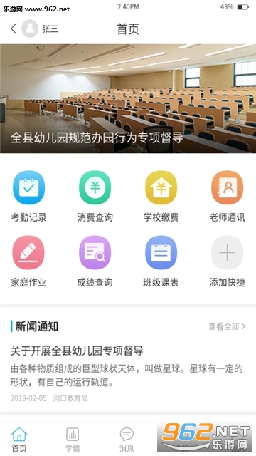 1、支持快捷功能、新闻通知、学生学情、消息、卡务、个人中心