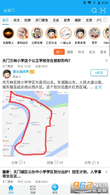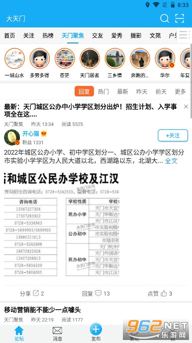 大天门论坛天门聚焦天门发布中,涵盖了本地新闻资讯,同城生活服务,同城交友聊天等多种优质的功能,在这里大家不仅可以享受到便捷的生活服务,赶紧下载体验一下吧。
