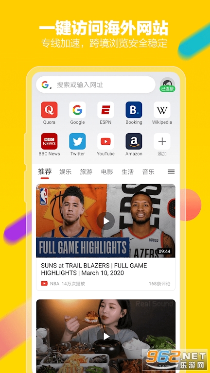 5、海外资讯:查阅海外留学信息、国外大学公开课及教学资源,便于青少年学习国际学科知识、开阔视野看世界。丰富的海外资源和信息,收发Gmail、hotmail,便于外贸、跨境营销人士轻松办公,满足海外追星追剧、蓝光高清视频、二次元动画新番、海外游戏、国际局势、国外文献、房产金融投资等丰富需求。