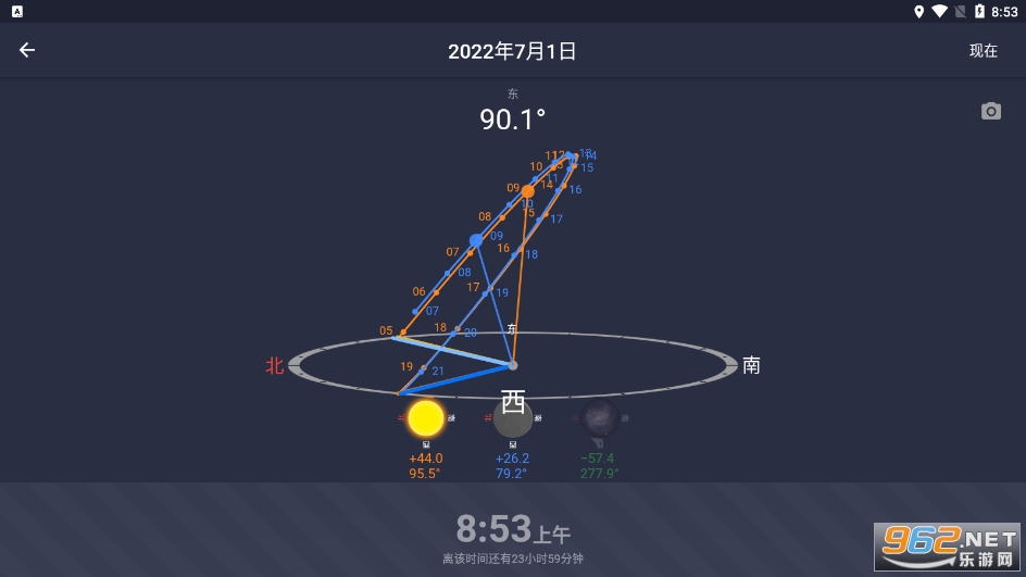 6、屏幕左下角的时间按钮,按一下就会变成现在时间。拖动滑块就可以看到月亮的移动轨迹。