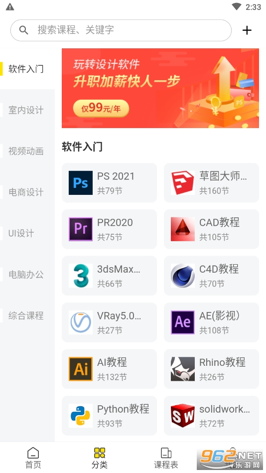 2、包含电商、平面、室内等多种设计课程,用户可以在羽兔网免费提升设计能力。