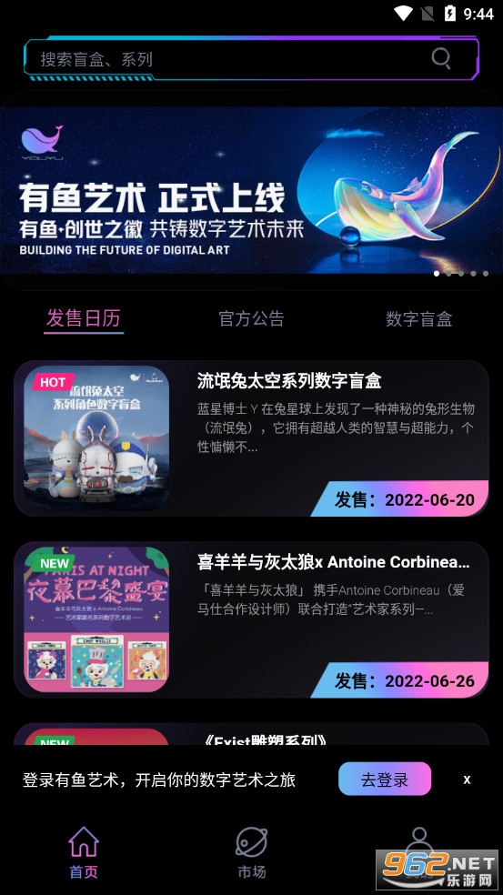 《有鱼艺术》是中手游旗下海南古茗科技有限公司推出的一款数字艺术品版权分发平台,进入有鱼艺术app可以看到各种艺术藏品,有着大量的预售藏品,点击预约提醒可以在售卖的时候及时的进行提醒,还有着数字盲盒等藏品可以购买使用。