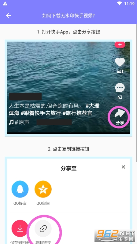 本应用软件可以实现下载无水印快手视频,适用于用户下载、保存无水印的视频内容。支持快手版、快手极速版视频下载。