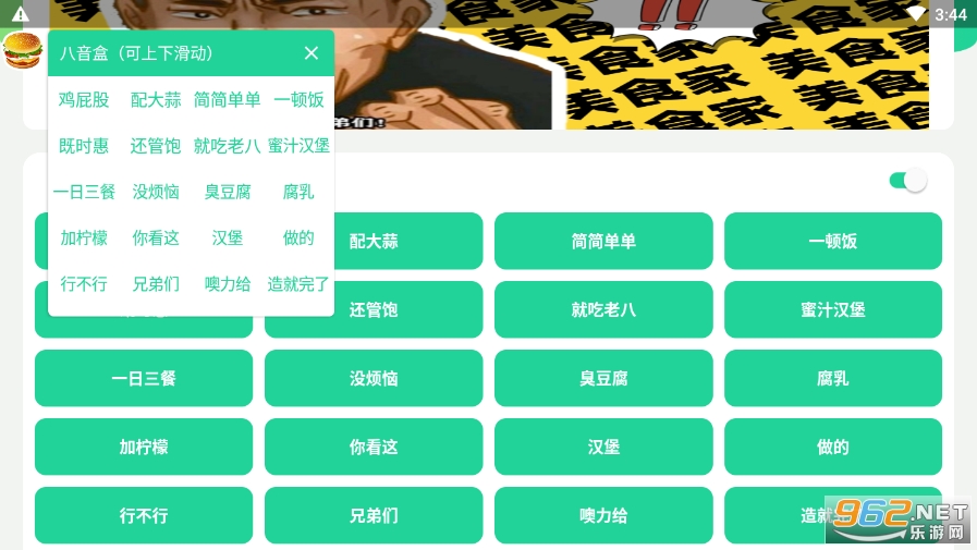 《八音盒1.0》是网红主播老八同款音频工具,老八全名岛市老八,是一名快手网红,之前是做吃播的,因为吃翔走红,他发布的视频都是以嗨害嗨作为开场白,声音比较有辨识度,因此也被成为八音盒,小编为大家带来了八音盒悬浮窗,大家可以自由点击鸡屁股,配大蒜,没烦恼,臭豆腐,腐乳,蜜汁汉堡,嘿嘿嘿等等语音使用!
