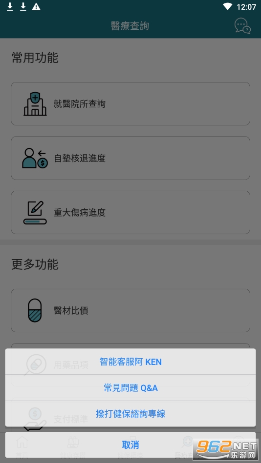 医疗查询:查询医疗院所、用药品项、特殊材料、支付标准、自费医材比价、急诊待床、急症处理查询等功能,于验证身分后提供个人自垫医疗费用核退案件办理进度、事前审查办理进度、重大伤病办理进度。
