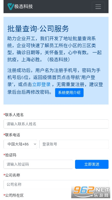 点击进入新功能后会显示这样一个页面,需要填写完成联系人姓名、联系电话、公司名称、公司地址等信息。注册成功后,用户名为注册手机号,密码为手机号后6位,返回疫情首页点击导航“登录”,建议登录后台后再修改密码。