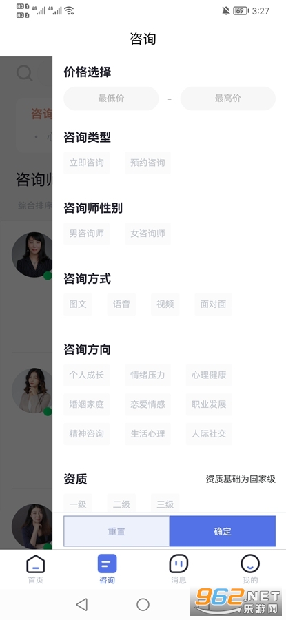 在线解惑:任意点击一位心理咨询师的头像即可查看其详细履历介绍,可以与咨询师即时对话,分享困惑。