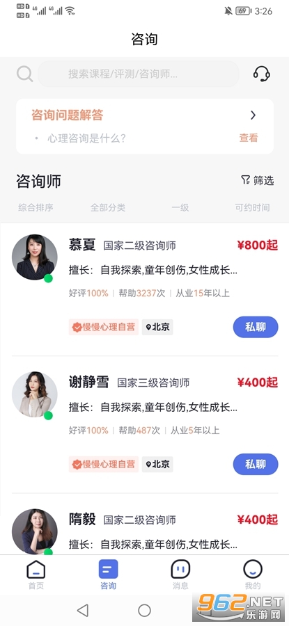 《慢慢心理app》是北京海豹宝科技有限公司推出的一款心理健康咨询软件,慢慢心理app入驻了大量的心里咨询师,有一级二级三级不同等级的咨询师可以咨询,可以根据价格、擅长领域、性别等来快速找到适合自己的心理咨询师,可以图文、视频、愈合面对面的交流。