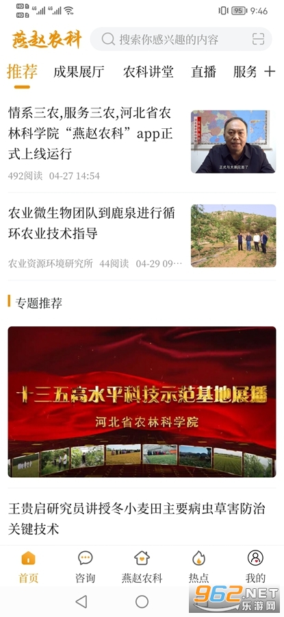 《燕赵农科app》是河北省农林科学院推出的一款农业科技资讯平台,燕赵农科app有着成果展厅、农科讲堂、直播、服务专家、科技合作、服务动态、示范基地等众多的栏目,朋友们可以在平台查看最新的农业相关资讯,可以在线资讯各种农业问题等。