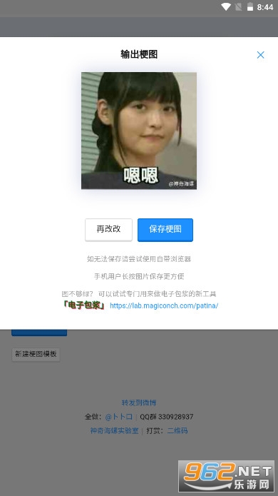 有一位网友制作了“神奇海螺梗图生成器”,支持背景图、文字、挂件、以及“电子包浆”等功能,完美打造你想要的表情包。