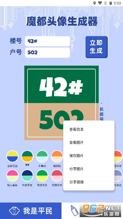 上海头像生成器其实就叫做魔都头像生成器,《魔都头像生成器上海头像生成器》是一款专门以上海团购需求为核心打造的手机软件,直接在软件中自定义搭配各种颜色,输入相对应的门牌号数字上传保存成头像就可以了,可以选择相对应的身份,也就是团长或者是平民,让大家能够更加轻松的找到对方。快来下载吧!