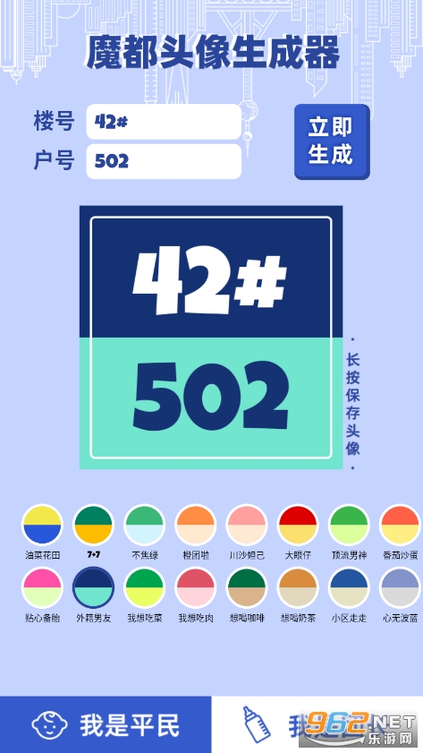 2、“我是平民”中,可以设置楼号和户号,仅支持输入数字和部分小符号(如*、),最多容纳4个字,不可输入中英文。同时提供了30款背景配色,并均标有可爱的备注。