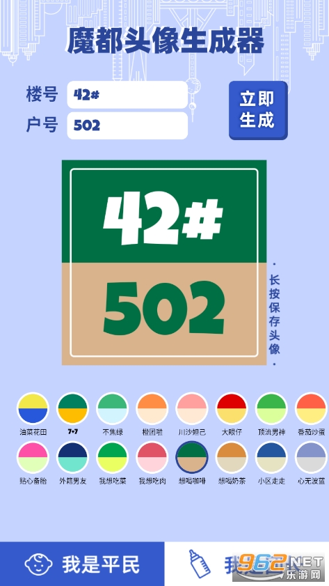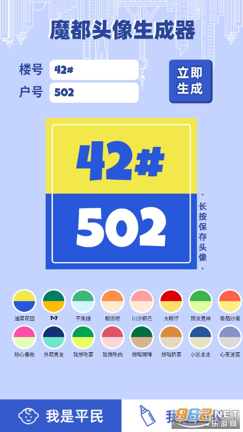 为大家带来最近朋友圈正火的门牌号头像制作软件,可以一键帮助大家生成门牌号头像,操作方便,还有油菜花田,大眼仔,外籍男友,我想吃肉,想喝咖啡等不同的颜色背景可以选择!